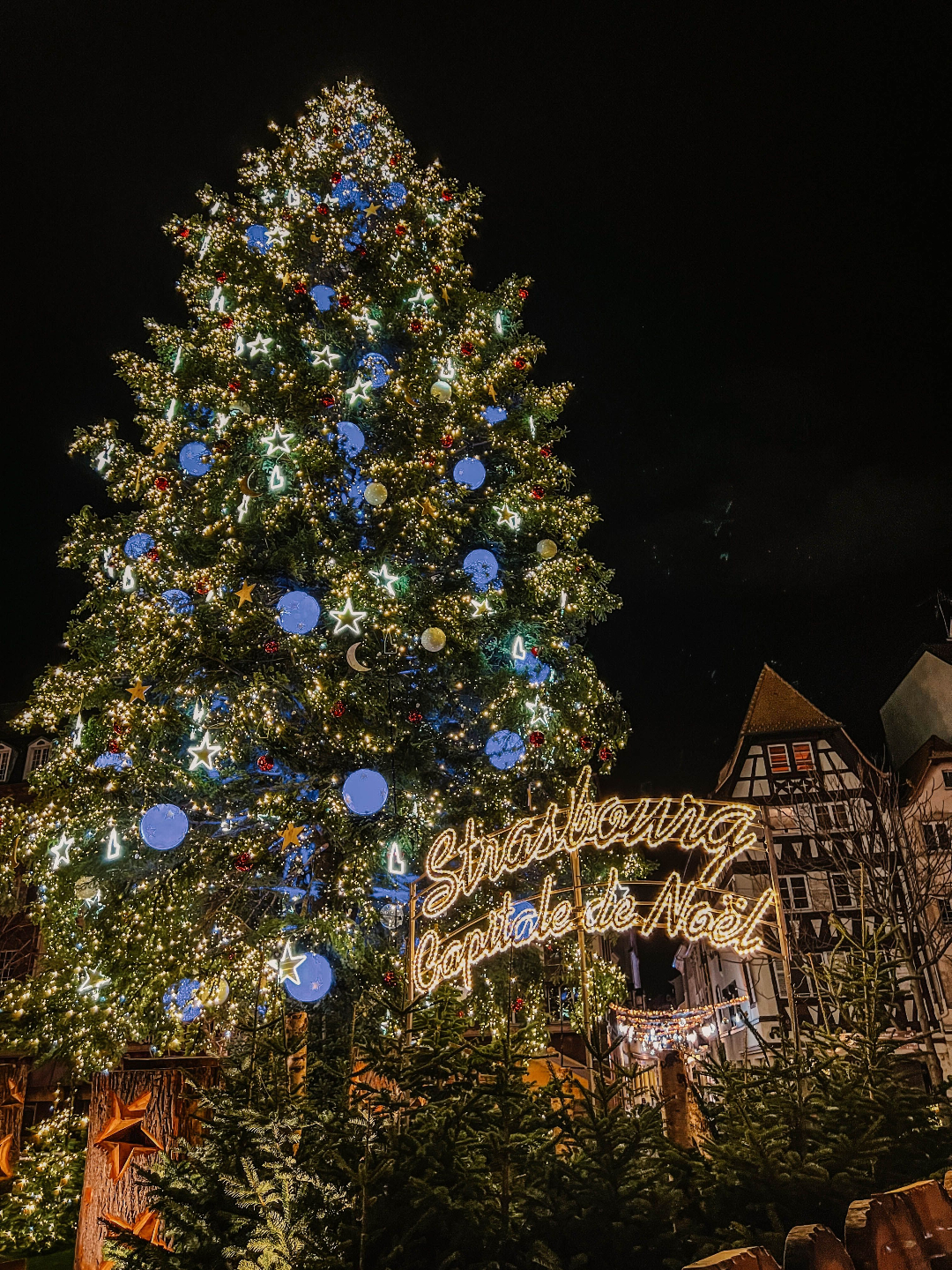 Strasbourg is known as the Capital of Christmas for a reason. This is where the tradition of Christmas markets truly comes alive. A towering Christmas tree dominates the main square, hundreds of stalls spill through the historic center, and the decorations are nothing short of spectacular. Think: half-timbered houses draped in lights, teddy bears and angels tucked into every corner, and even Baccarat crystal chandeliers glittering above the streets.